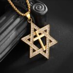 Este colgante fusiona la Estrella de David, símbolo de herencia y promesa, con la Cruz, emblema de fe, redención y esperanza. Su acabado dorado premium y cristales de alto brillo reflejan distinción, carácter y devoción en cada detalle.