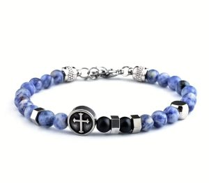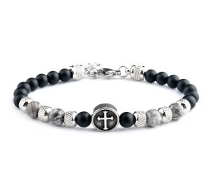 Fabricada con piedras naturales de ónix negro, símbolo de protección y claridad espiritual, junto a piedras de ojo de tigre, que representan enfoque, valentía y determinación. El diseño se complementa con aplicaciones metálicas en acero brillante y una cruz central minimalista, recordatorio constante de que Cristo es tu fortaleza.